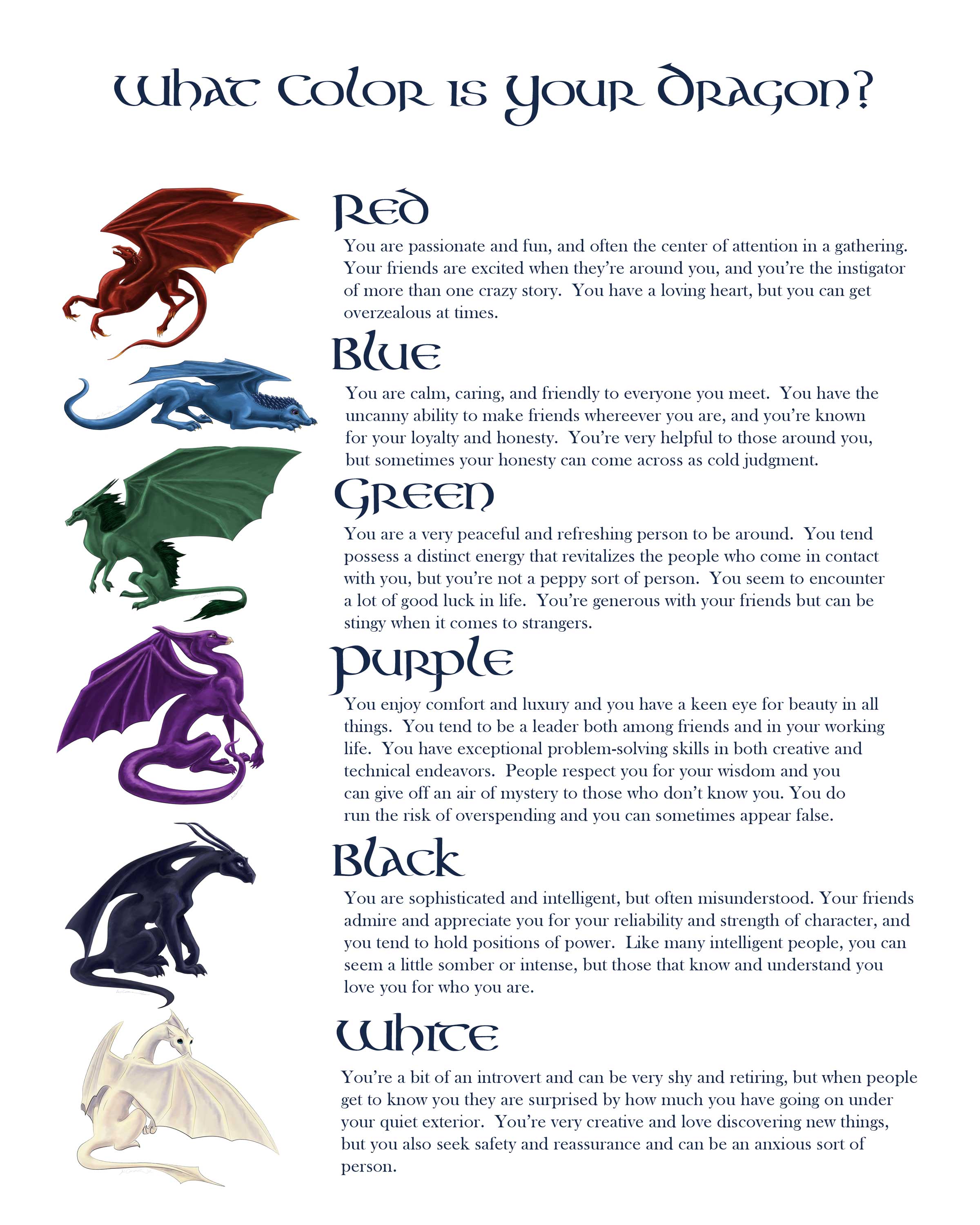 Most dragons live in very small groups, usually one or two individuals in a lair. Except for some green dragons which have been seen in groups of 3-5 dragons. Each color defines the dragons personality. Some even suggest that the color of the dragon can be used to define your own personality. What color is your dragon?
